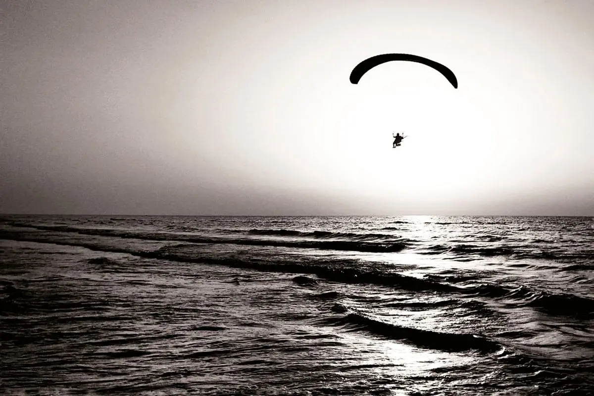عکس: افقی، سیه سپید، مردی با چتر بر فراز دریا در حال فرود آمدن در غروب.