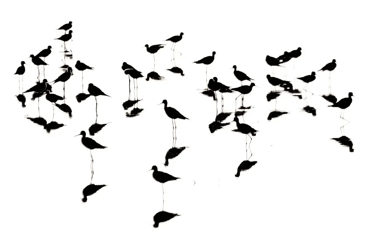 عکس نخست: سی پرنده (مرغان ماهیخوار) با بازتاب‌هایشان، حذف رنگ، پراکندگی و توازن ترازویی با جاهای خالی، گستردگی چشم چرخان، حذف عامدانه و هنرمندانه رنگ، بازی سایه و واقعیت.