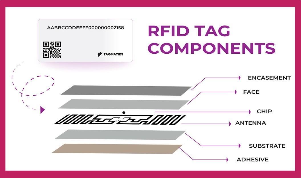 تگ RFID از سه بخش چیپ، آنتن و پوسته تشکیل می شود، چیپ یا تراشه یک مدار مجتمع الکترونیکی یا IC می باشد که از هزاران ترانزیستور یا ریز پردازنده تشکیل شده و وظیفه آن ذخیره اطلاعات می باشد . انرژی مورد نیاز تراشه در تگ های پسیو، از طریق انرژی الکترومغناطیسی- که توسط آنتن دریافت می شود و ریدر این امواج را منتشر می نماید-دریافت می شود .