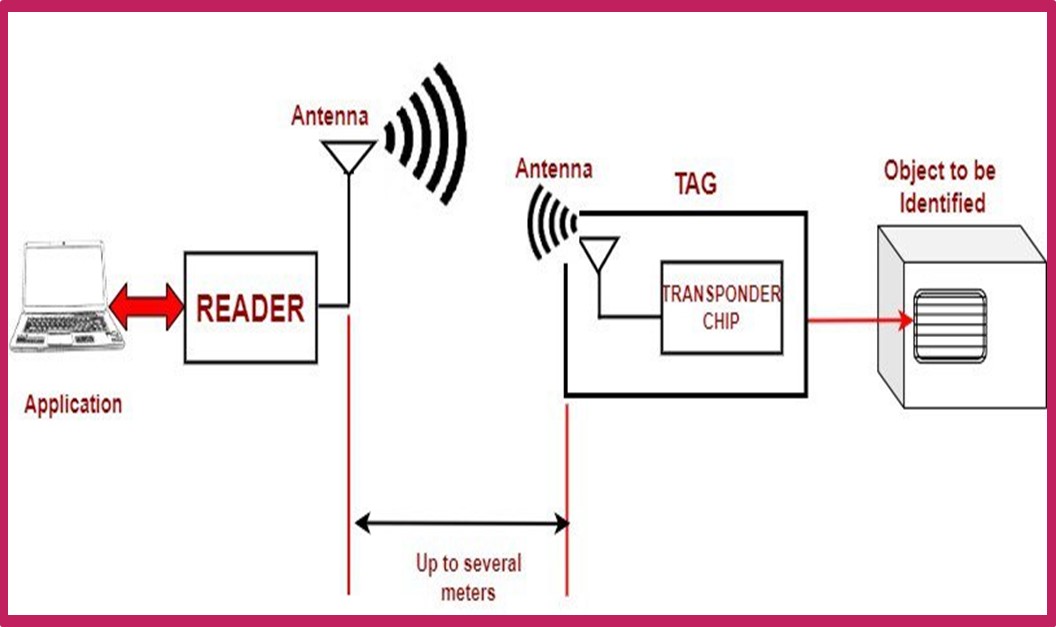 یک سیستم RFID از دو قسمت اصلی تشکیل می گردد یکی فرستنده یا همان تگ RFID که معمولا به صورت کارت بوده و یا روی اجسام چسبانده می شود و دیگری گیرنده یا همان ریدر RFID می باشد که هم به عنوان فرستنده و هم به عنوان گیرنده عمل می کند . این ریدر از یک ماژول فرکانس رادیوئی، یک واحد کنترل و آنتن تشکیل می شود که میدان الکترومغناطیسی با فرکانس بالا تولید نموده و از طریق امواج رادیوئی با تگ ارتباط برقرار می نماید .