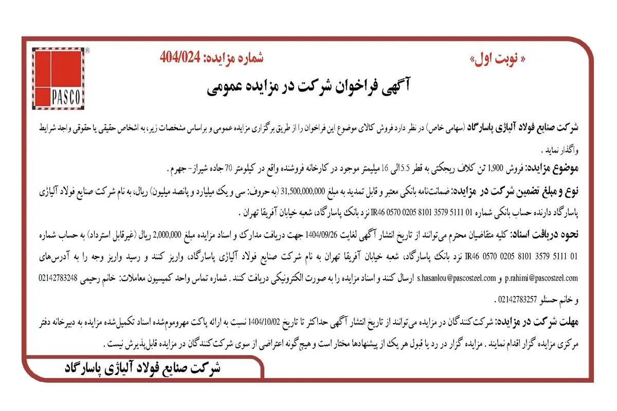 آگهی فراخوان شرکت در مزایده عمومی از شرکت فولاد آلیاژی پاسارگاد