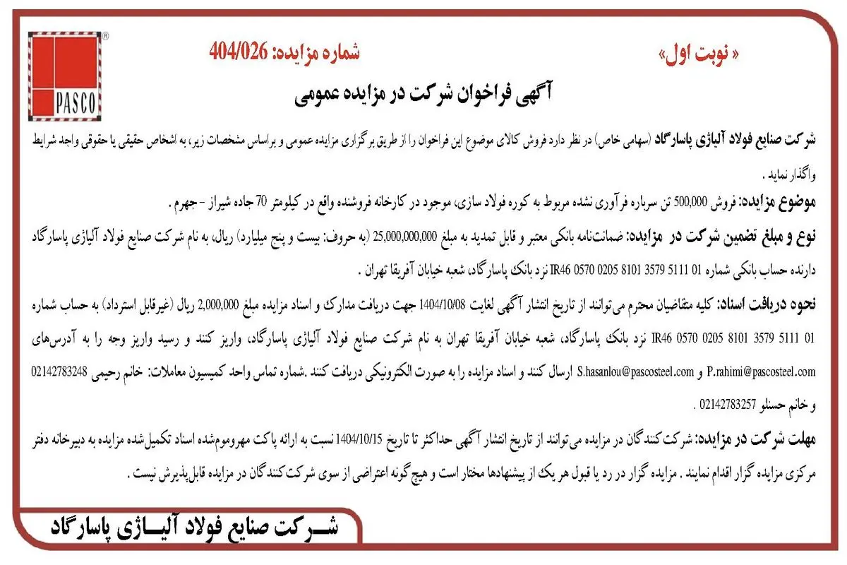 موضوع مزایده: فروش 500,000 تن سرباره فرآوری نشده مربوط به کوره فولاد سازی، موجود در کارخانه فروشنده واقع در کیلومتر 70 جاده شیراز - جهرم . نوع و مبلغ تضمین شرکت در مزایده:ضمانت نامه بانکی معتبر و قابل تمدید به مبلغ25,000,000,000 (به حروف:بیست و پنج میلیارد)ریال، به نام شرکت صنایع فولاد آلیاژی پاسارگاد دارنده حساب بانکی شماره 01 5111 3579 8101 0205 0570 IR46 نزد بانک پاسارگاد، شعبه خیابان آفریقا تهران . نحوه دریافت اسناد: کلیه متقاضیان محترم میتوانند از تاریخ انتشار آگهی لغایت 1404/10/08 جهت دریافت مدارک و اسناد مزایده مبلغ 2,000,000 ریال (غیرقابل استرداد) به حساب شماره 01 5111 3579 8101 0205 0570 IR46 نزد بانک پاسارگاد، شعبه خیابان آفریقا تهران به نام شرکت صنایع فولاد آلیاژی پاسارگاد، واریز کنند و رسید واریز وجه را به آدرسهای P.rahimi@pascosteel.com و S.hasanlou@pascosteel.com ارسال کنند و اسناد مزایده را به صورت الکترونیکی دریافت کنند .شماره تماس واحد کمیسیون معاملات: خانم رحیمی 02142783248 و خانم حسنلو 02142783257 . مهلت شرکت در مزایده: شرکتکنندگان در مزایده میتوانند از تاریخ انتشار آگهی حداکثر تا تاریخ 1404/10/15 نسبت به ارائه پاکت مهر و مومشده اسناد تکمیل شده مزایده به دبیرخانه دفتر مرکزی مزایده گزار اقدام نمایند . مزایده گزار در رد یا قبول هر یک از پیشنهادها مختار است و هیچگونه اعتراضی از سوی شرکت کنندگان در مزایده قابلپذیرش نیست .