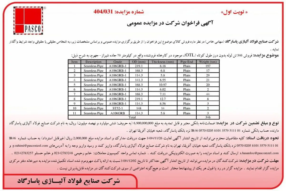 آگهی فراخوان شرکت در مزایده عمومی فروش ۳۴۶ تن لوله بدون درز