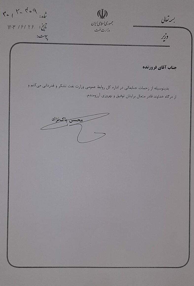«بدینوسیله از زحمات جنابعالی در اداره کل روابط عمومی وزارت نفت تشکر و قدردانی میکنم و از درگاه خداوند قادر متعال برایتان توفیق و بهروزی آرزومندم.»